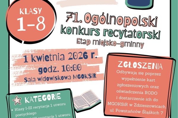 Informuje się o organizacji 71. Ogólnopolskiego Konkursu Recytatorskiego „Mały OKR 2026” na etapie miejsko-gminnym. Wydarzenie skierowa...