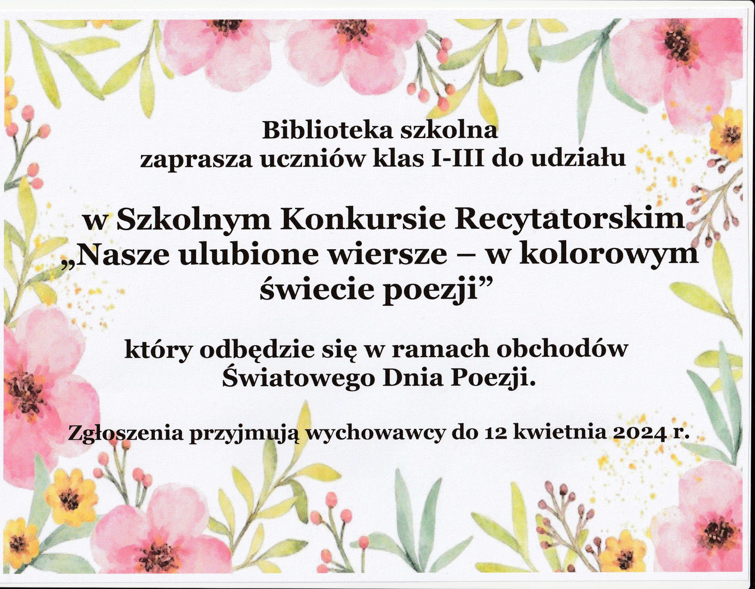 Aktualności uczniowskie SZKOLNY KONKURS RECYTATORSKI DLA UCZNIÓW KLAS 1 – 3 Opublikowano przez @PSP Żyrowa 2024-04-02 Data publikacji: 2024-04-02 Poniżej do pobrania regulamin oraz karta zgłoszenia ( kliknij) konkurs-recytatorski-2024-zgloszeniePobierz Konkurs-recytatorski-2024Pobierz