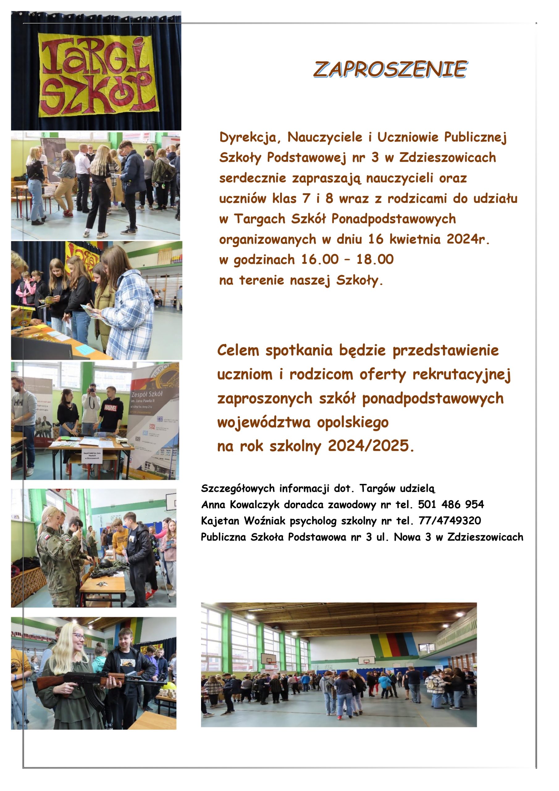 Aktualności uczniowskie ZAPROSZENIE NA TARGI SZKÓŁ Opublikowano przez @PSP Żyrowa 2024-04-11 Data publikacji: 2024-04-11