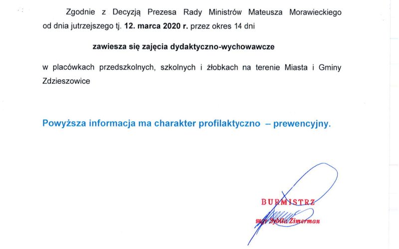 12 i 13 marca 2020 r. szkoła organizuje zajęcia opiekuńcze dla uczniów, którym rodzice nie są w stanie zapewnić opieki.
