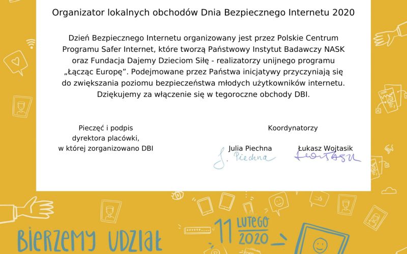 OTRZYMALIŚMY ZAŚWIADCZENIE ZA WŁĄCZENIE SIĘ W OBCHODY DBI 2020