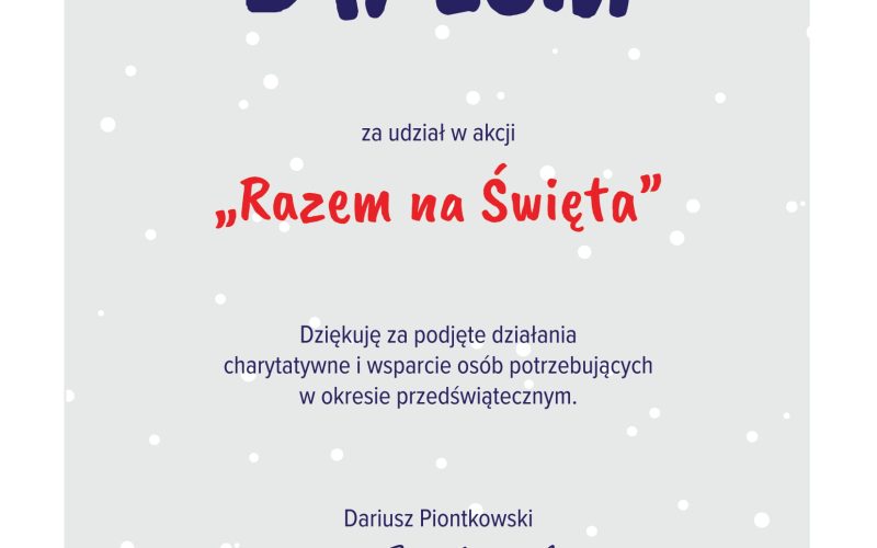 NASZA SZKOŁA OTRZYMAŁA PODZIĘKOWANIE ZA WŁĄCZENIE SIĘ DO AKCJI ” RAZEM NA ŚWIĘTA”