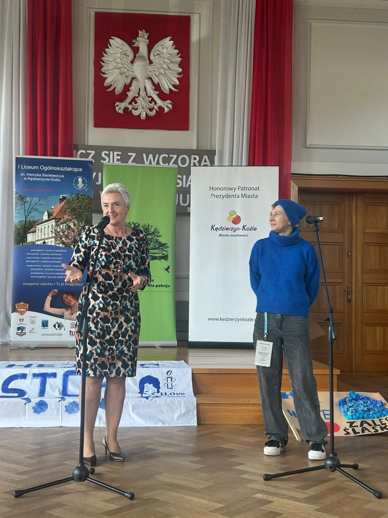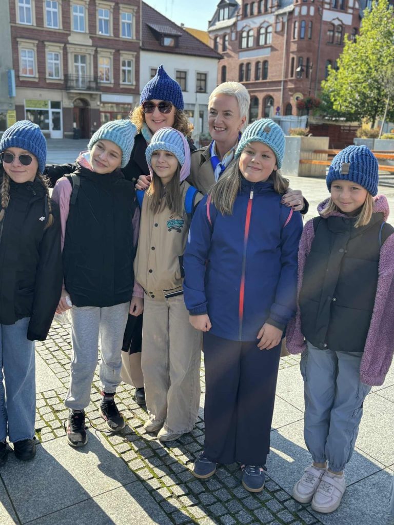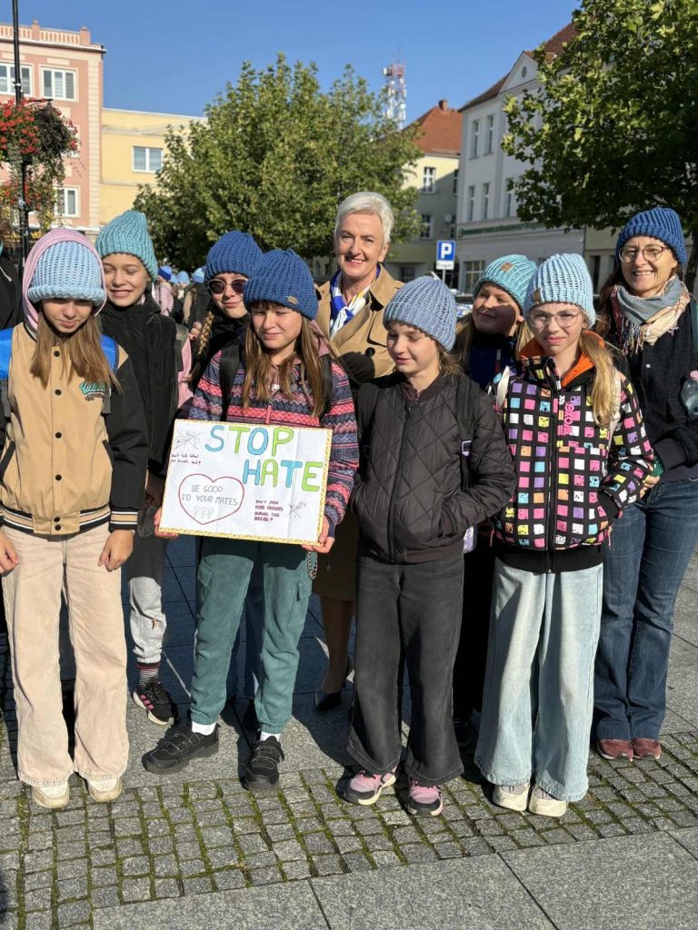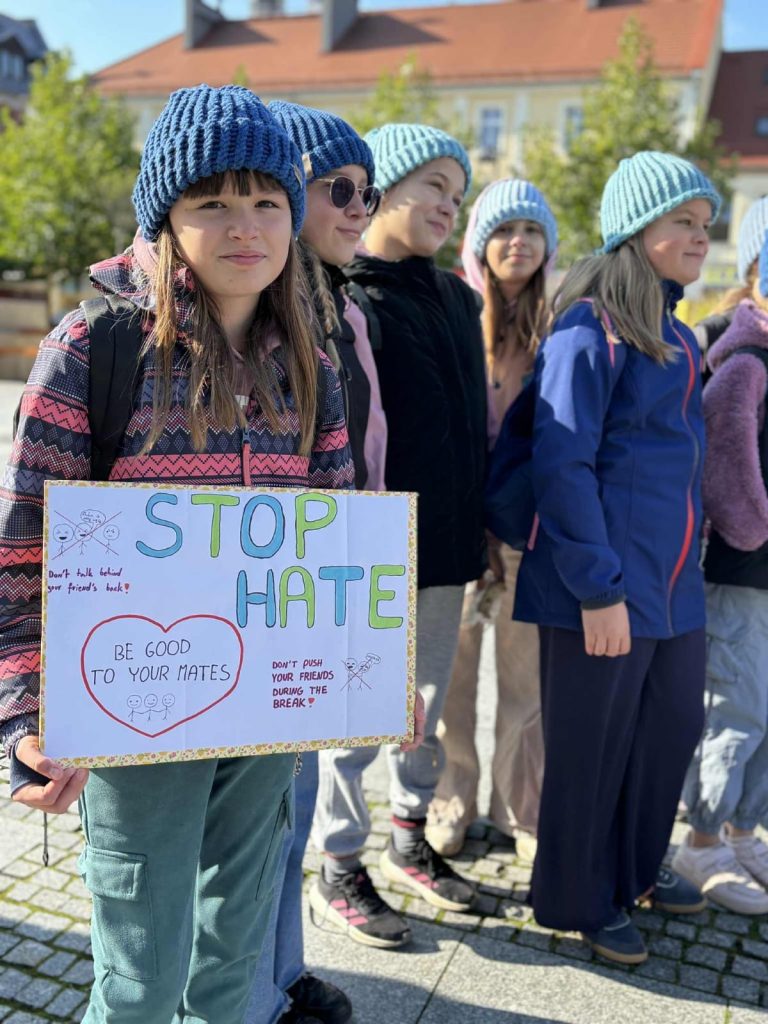 02.10.2025 kozielski rynek wypełnił się uczniami szkół podstawowych i ponadpodstawowych, ubranych w niebieskie czapki, by wspólnie zademonstrować swój sprzeciw wobec hejtu i przemocy. Inicjatorem spotkania była kędzierzyńska Fundacja dla Pokoju, w ramach projektu HatNotHate, w którym już od roku uczestniczy też nasza szkoła. Uczennicom zaangażowanym w akcję towarzyszyli opiekunowie : Pani dyrektor Katarzyna Jajuga oraz Pani Aleksandra Mateja. Spotkanie stało się okazją do przypomnienia, jak istotne jest reagowanie na przemoc, jak ważna jest empatia i wzajemny szacunek. Wysłuchaliśmy przemówienia Pani prezydent miasta Kędzierzyna – Koźla, Sabiny Nowosielskiej, która objęła tegoroczny marsz swoim patronatem. Było to ciekawe spotkanie.