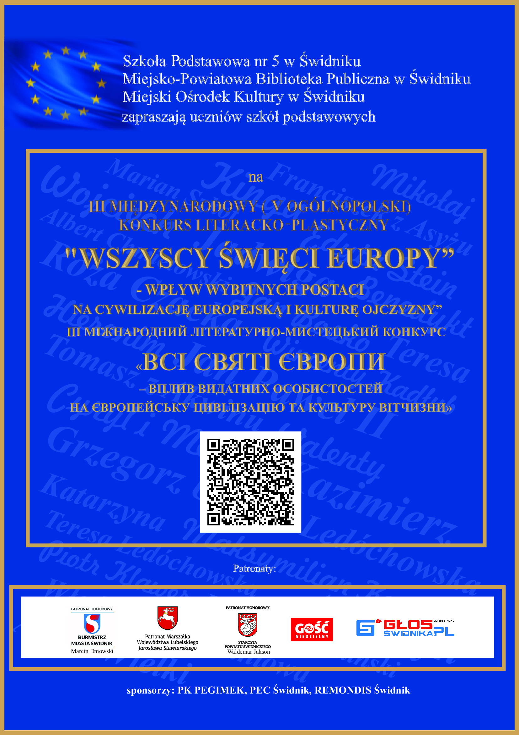 Aktualności uczniowskie, Rok szkolny 2025/2026 III MIĘDZYNARODOWY KONKURS LITERACKO – PLASTYCZNY ” WSZYSCY ŚWIĘCI EUROPY” – WPŁYW WYBITNYCH POSTACI NA CYWILIZACJĘ EUROPEJSKĄ I KULTURĘ OJCZYZNY ( kliknij) Opublikowano przez @PSP Żyrowa 2026-01-07 Data publikacji: 2025-10-29 Plakat WSE 2025Pobierz REGULAMIN I MIĘDZYNARODOWEGO KONKURSU 2025Pobierz Załącznik konkurs 2025Pobierz Załącznik konkursУКР 2025Pobierz