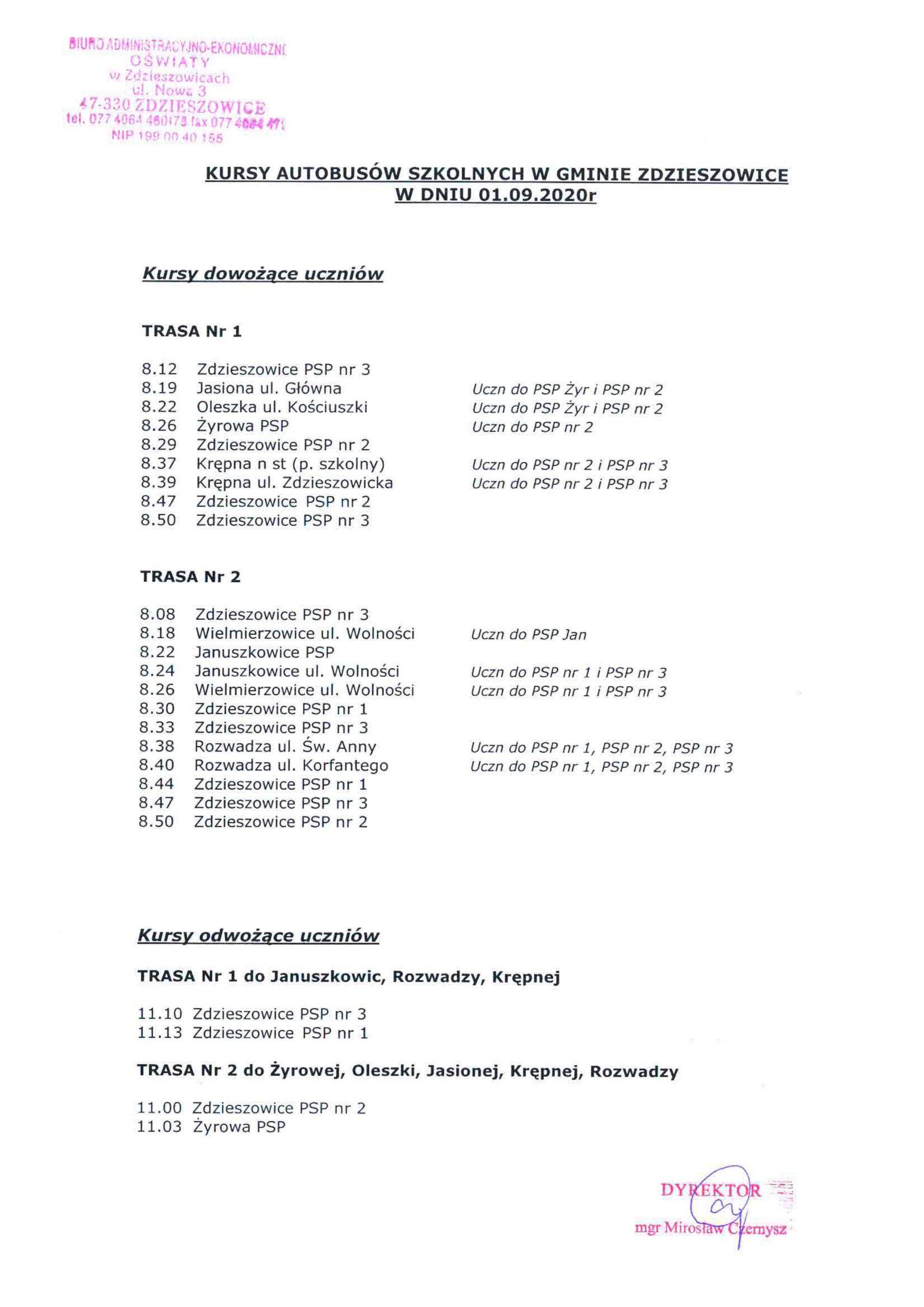 Aktualności, Aktualności uczniowskie KURSY AUTOBUSÓW SZKOLNYCH W GMINIE ZDZIESZOWICE DNIA 01.09.2020 r. Opublikowano przez @PSP Żyrowa 2020-08-27 Data publikacji: 2020-08-27