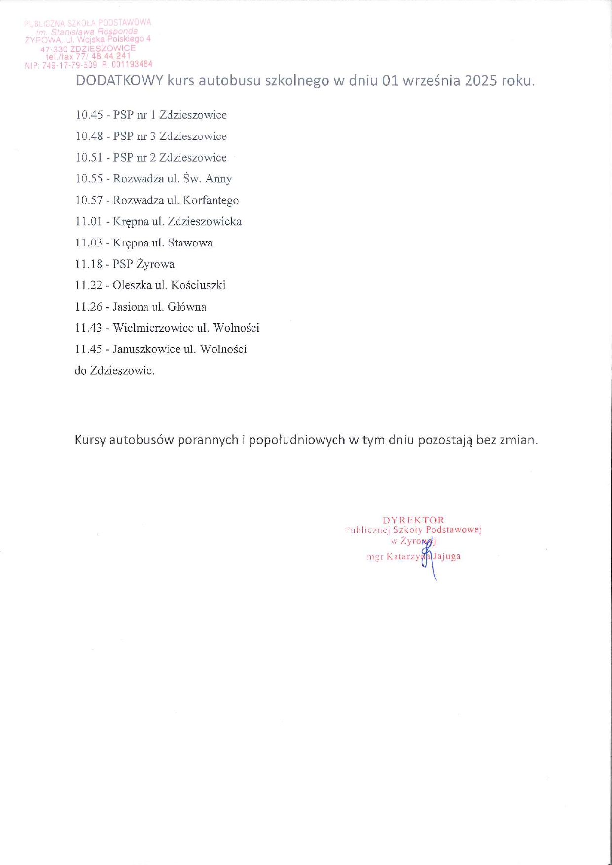 Aktualności uczniowskie, Rok szkolny 2025/2026 DODATKOWY KURS AUTOBUSU SZKOLNEGO w DNIU 01 WRZEŚNIA 2025 r. ( kliknij) Opublikowano przez @PSP Żyrowa 2026-01-07 Data publikacji: 2025-08-28