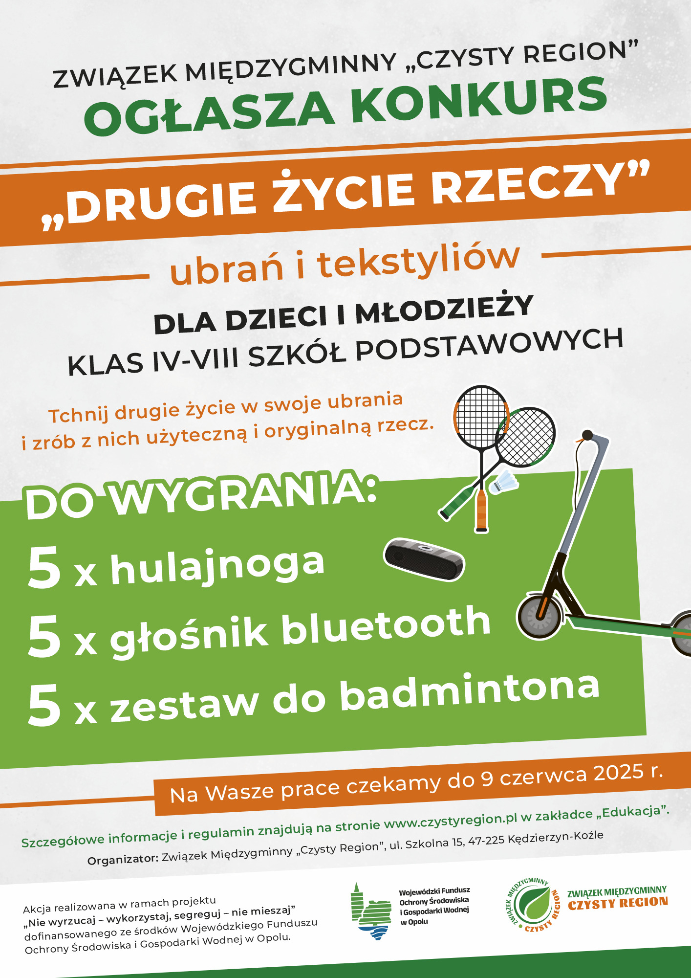 Aktualności uczniowskie MIĘDZYGMINNY KONKURS ” DRUGIE ŻYCIE RZECZY”: ” DRUGIE ŻYCIE TWOICH UBRAŃ” ( KLIKNIJ) Opublikowano przez @PSP Żyrowa 2025-05-21 Data publikacji: 2025-05-21 Karta_zgłoszenia_do_konkursu_-_Załącznik_nr_1_do_Regulaminu DRUGIE ŻYCIE RZECZY 2025Pobierz Karta_zgłoszenia_do_konkursu_-_Załącznik_nr_1_do_Regulaminu-1Pobierz Regulamin konkursu DRUGIE ŻYCIE RZECZY – drugie życie Twoich ubrańPobierz
