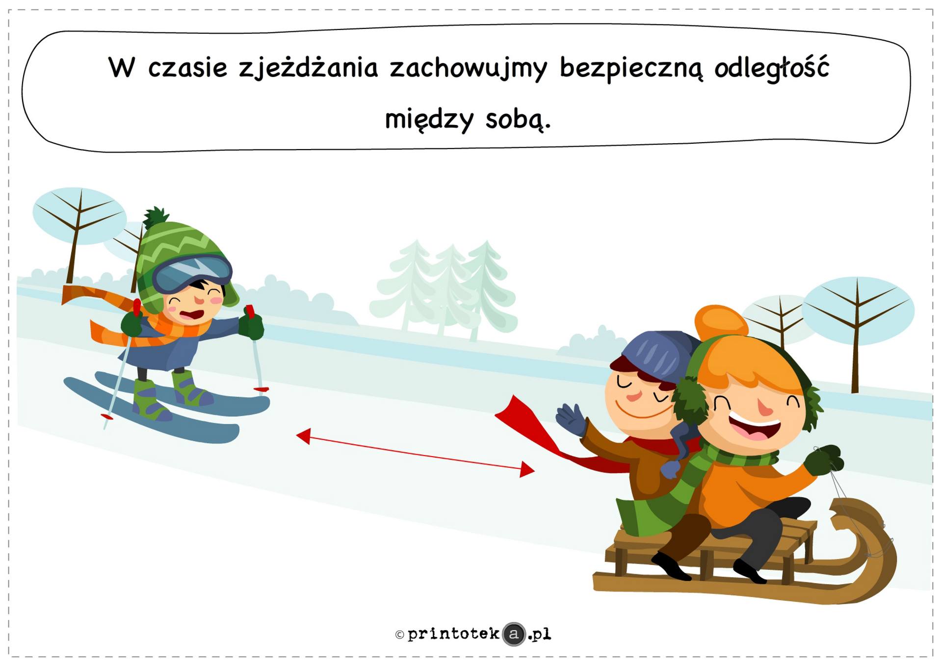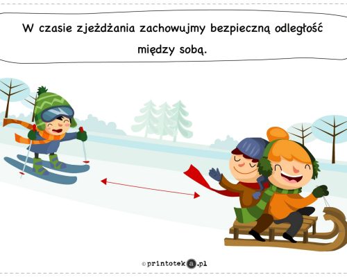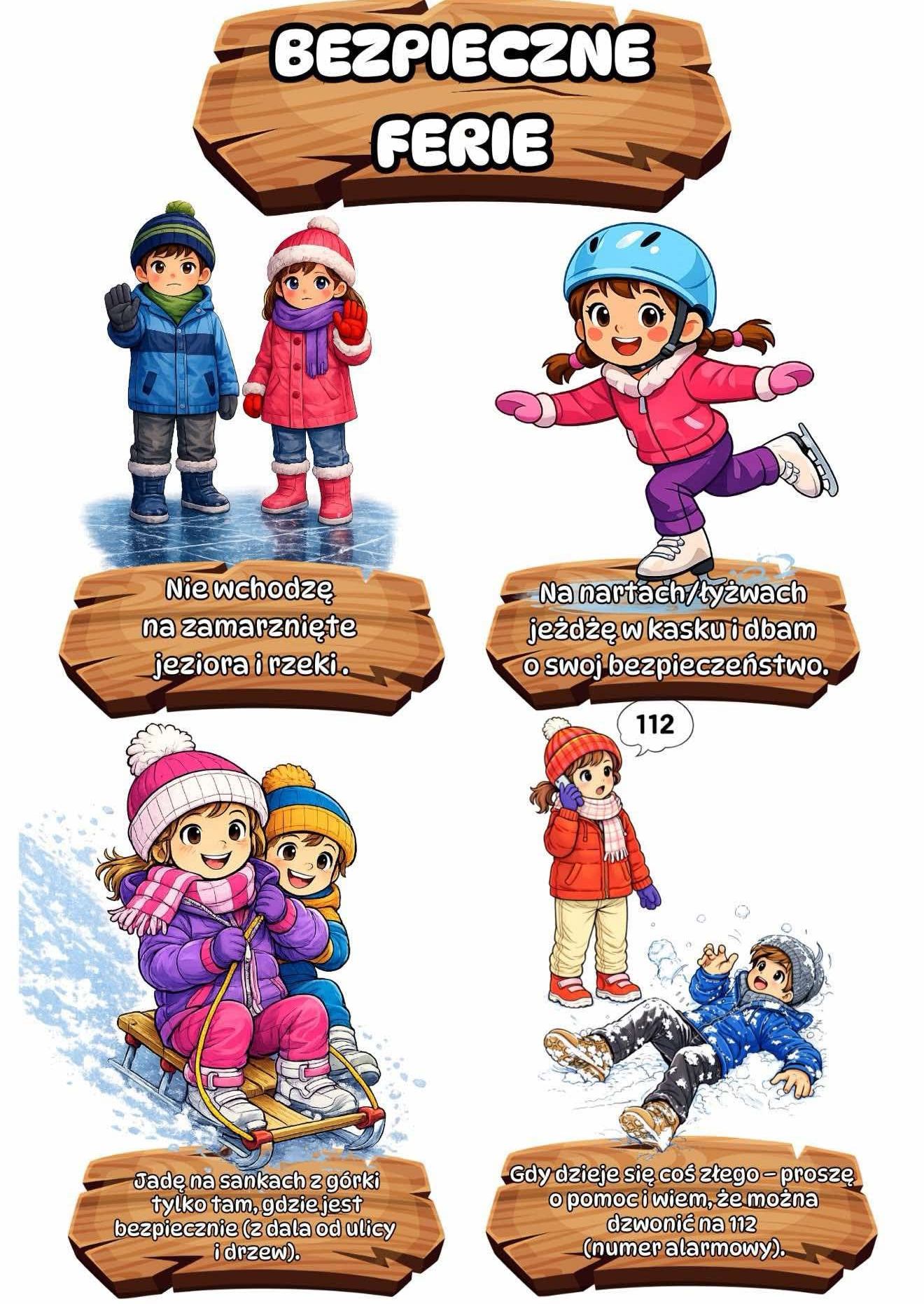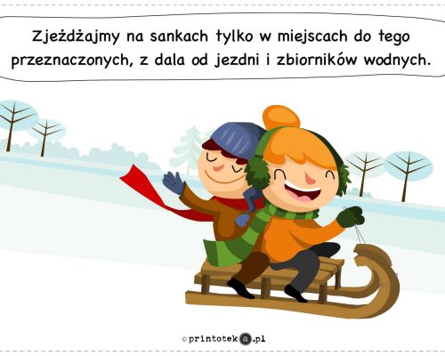 Zabawy na śniegu i lodzie powinny odbywać się wyłącznie w miejscach do tego przeznaczonych i pod nadzorem dorosłych. Zjazdy na sankach należy organizować z dala od jezdni i zbiorników wodnych, a jazda na łyżwach powinna odbywać się jedynie na sztucznych lodowiskach. Przypomina się również o bezwzględnym zakazie doczepiania sanek do pojazdów mechanicznych.