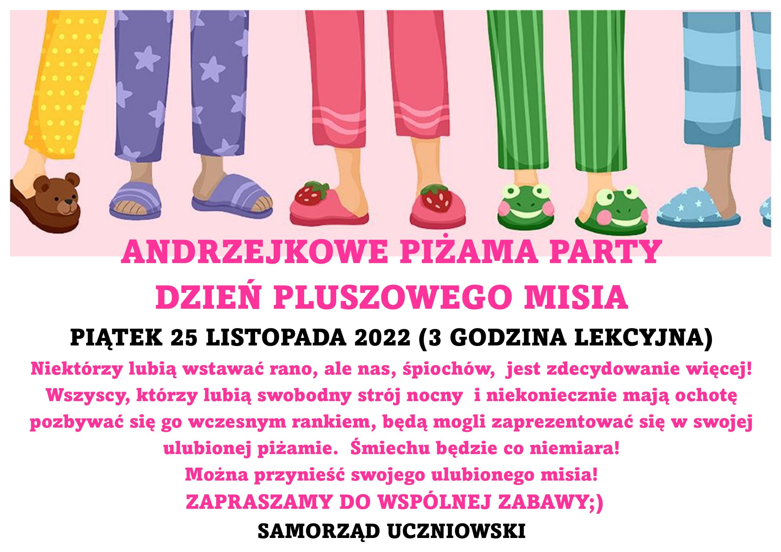 Aktualności uczniowskie PIŻAMA PARTY I DZIEŃ PLUSZOWEGO MISIA 25.11.2022 Opublikowano przez @PSP Żyrowa 2022-11-24 Data publikacji: 2022-11-24