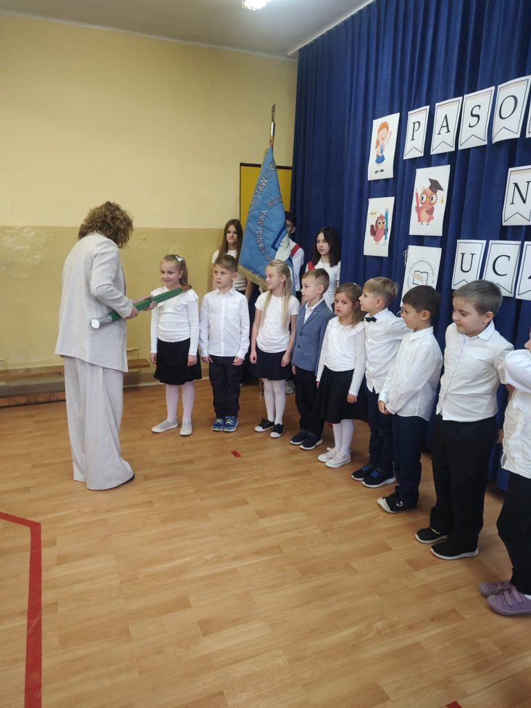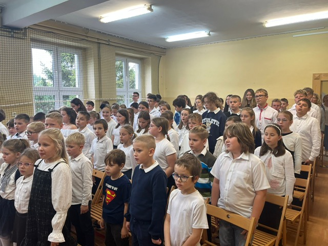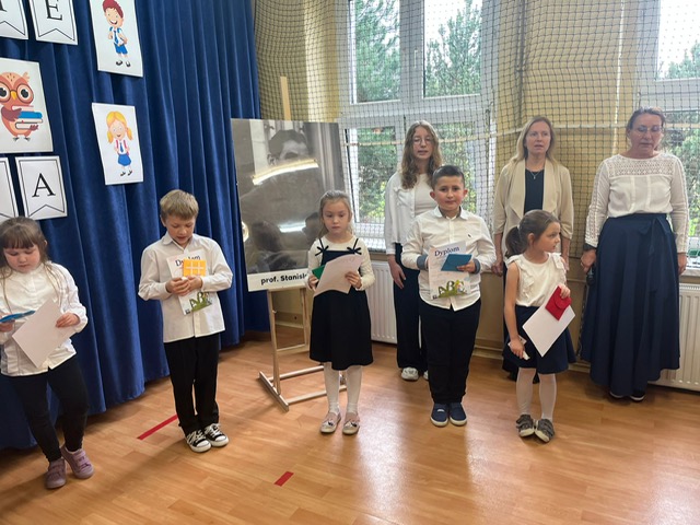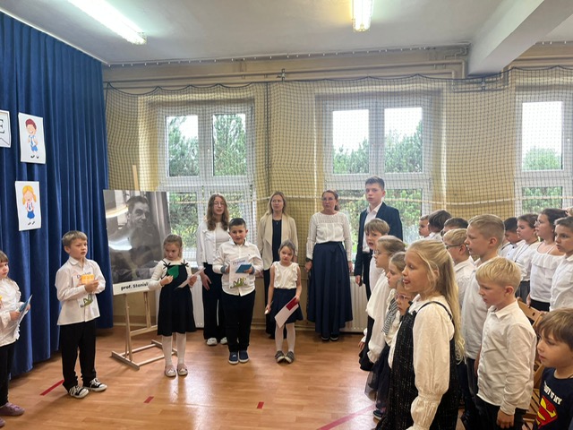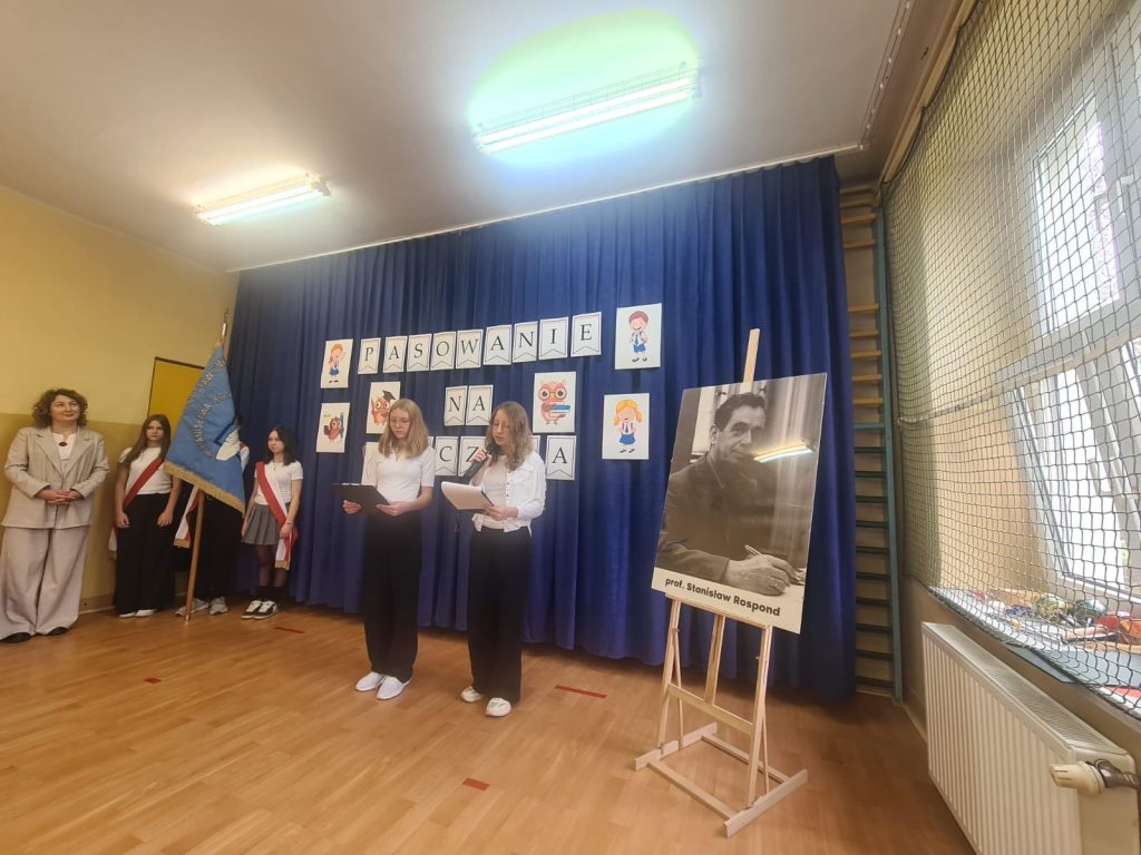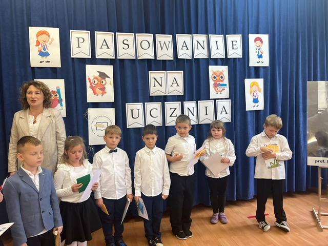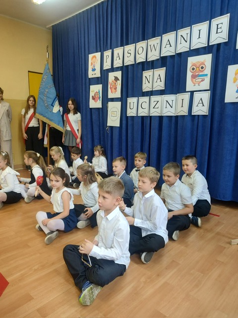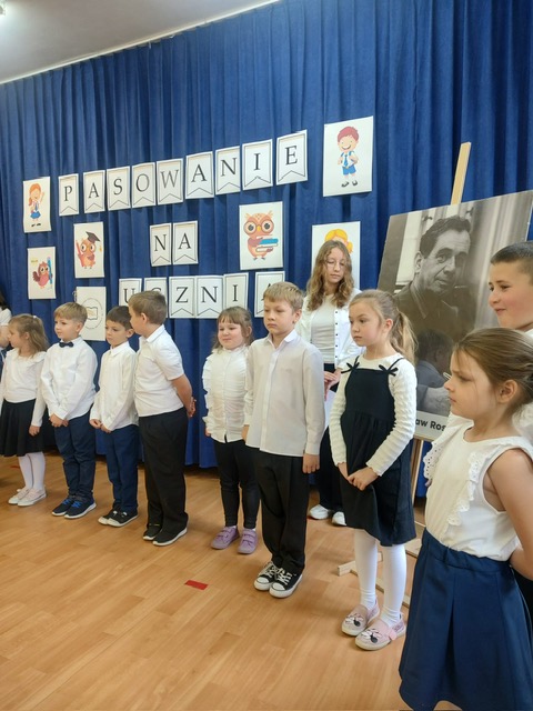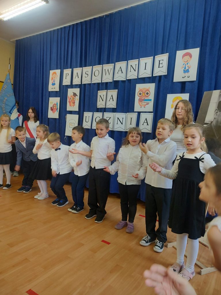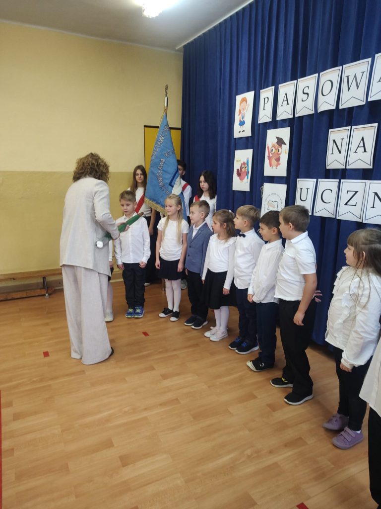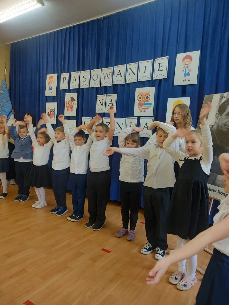 W tym ważnym dniu odbyło się uroczyste Pasowanie na Ucznia. Dzieci z klasy pierwszej wstąpiły do grona społeczności uczniowskiej. Na początku pięknie zaprezentowały się podczas montażu słowno – muzycznego. Gromkie brawa świadczyły o tym, iż dzieci przygotowały się znakomicie. Musiały również przejść turniej wiedzy, który zdali celująco. Pani Dyrektor Katarzyna Jajuga wobec wszystkich zebranych, dokonała symbolicznym ołówkiem aktu pasowania, wręczając uczniom pamiątkowe dyplomy oraz legitymacje szkolne. Uczniowie klasy I złożyli uroczyste ślubowanie, „że będą dobrymi Polakami, będą godnie reprezentować swoją szkołę: zachowaniem i nauką sprawiać radość rodzicom i nauczycielom; będą przyjaciółmi zwierząt i roślin; będą szanować wszystkich ludzi …”