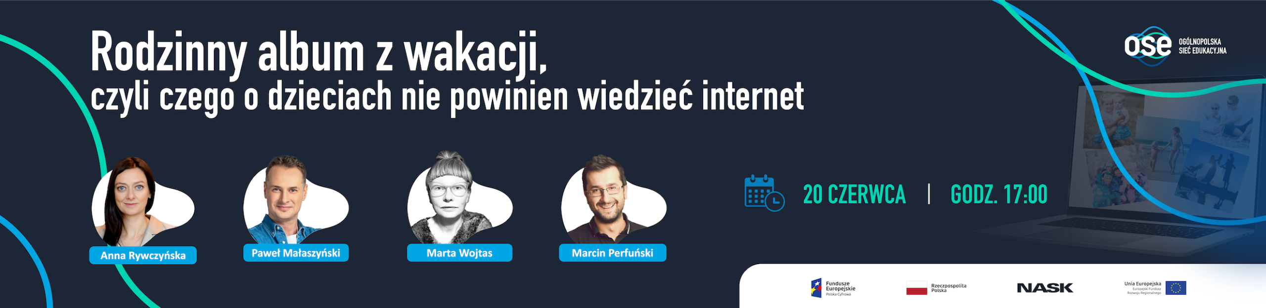 Rocznie, statystyczny rodzic, wrzuca do sieci średnio 72 zdjęcia i 24 filmy ze swoimi pociechami ! W internecie nic nie ginie – niby wszyscy o tym wiemy, ale myślimy, że nas to nie dotyczy. Błahe z pozoru zdjęcie dziecka w serwisie społecznościowym może jednak wiązać się z poważnymi konsekwencjami. Jakimi? Porozmawiamy o tym w trakcie bezpłatnego webinaru OSE „Rodzinny album z wakacji – czyli czego o dzieciach nie powinien wiedzieć internet”, który organizujemy właśnie dla Was – rodziców, nauczycieli, pedagogów i psychologów. W spotkaniu wezmą udział: