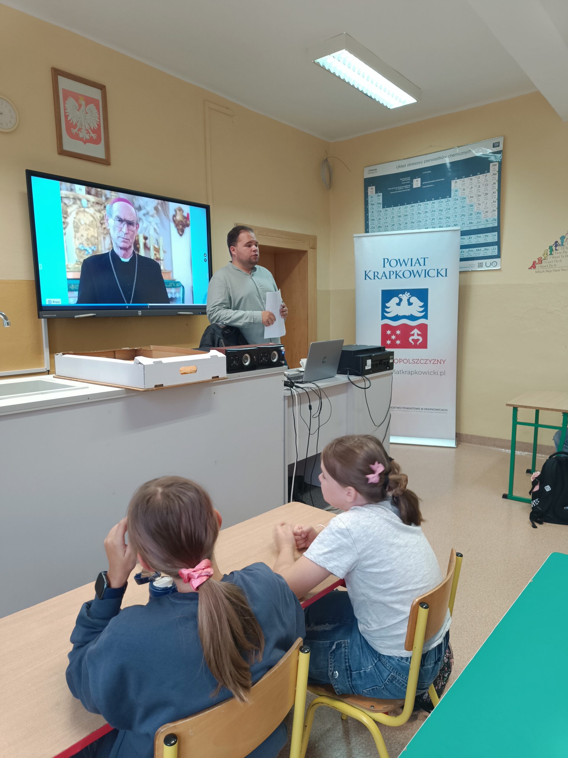 W dniu 23.09.2025 r. odbyło się spotkanie z przedstawicielem fundacji „Piastun” w ramach projektu „W sercu Opolszczyzny, śladami kultury historii i tradycji powiatu krapkowickiego”. Było dużo opowieści o historii ziemi powiatu krapkowickiego zwanego także miejscem zamków i pałaców. Uczniowie rozmawaiali o tradycjach śląskich, skosztowali śląskiego kałacza. Ciekawe informacje dotyczyły również przemysłu i zakładów pracy aktualnych i tych które już nie działają, rzeki Odry i ciągle pływającego promu obsługiwanego ręcznie. Uczniowie wzięli udział w krótkim quizie. W nagrodę za dobrą odpowiedź otrzymali mapę powiatu z zaznaczonymi zabytkami.