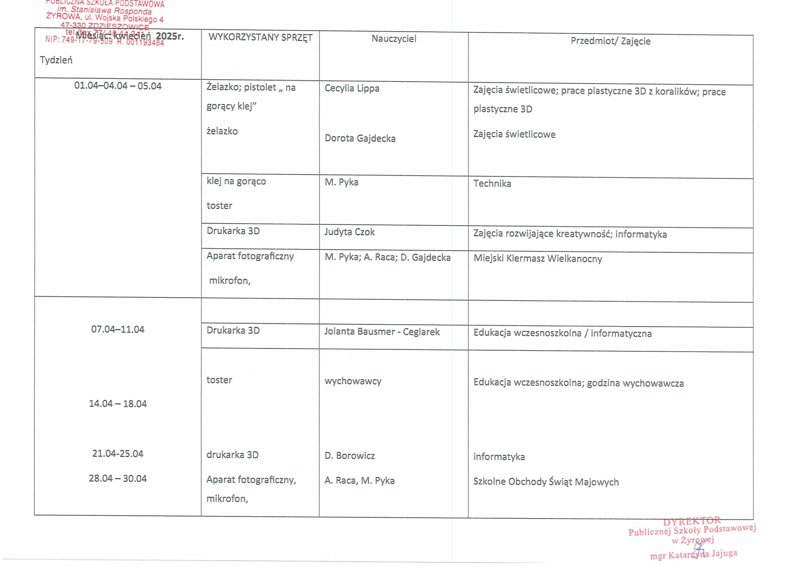 Laboratoria Przyszłości, Rok szkolny 2024/2025 WYKORZYSTANIE SPRZĘTU W KWIETNIU 2025r. Opublikowano przez @PSP Żyrowa 2025-04-30 Data publikacji: 2025-04-30 laboratoriaPobierz