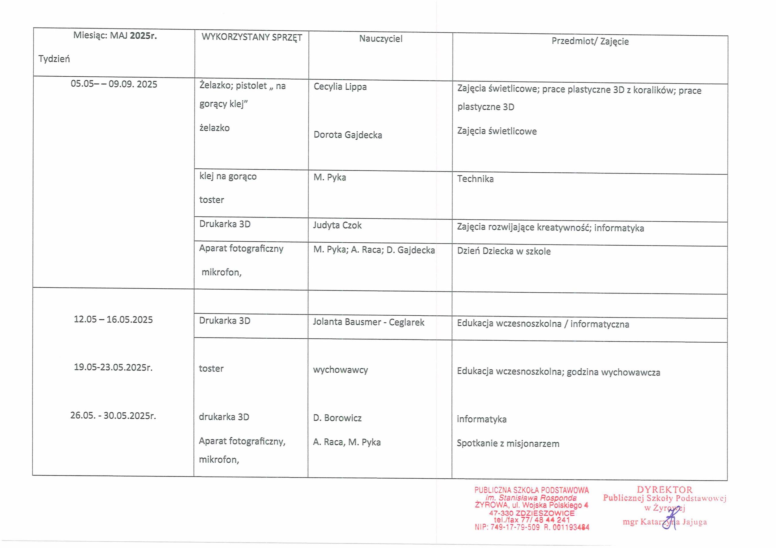 Aktualności uczniowskie WYKORZYSTANIE SPRZĘTU W MAJU Opublikowano przez @PSP Żyrowa 2025-06-02 Data publikacji: 2025-06-02