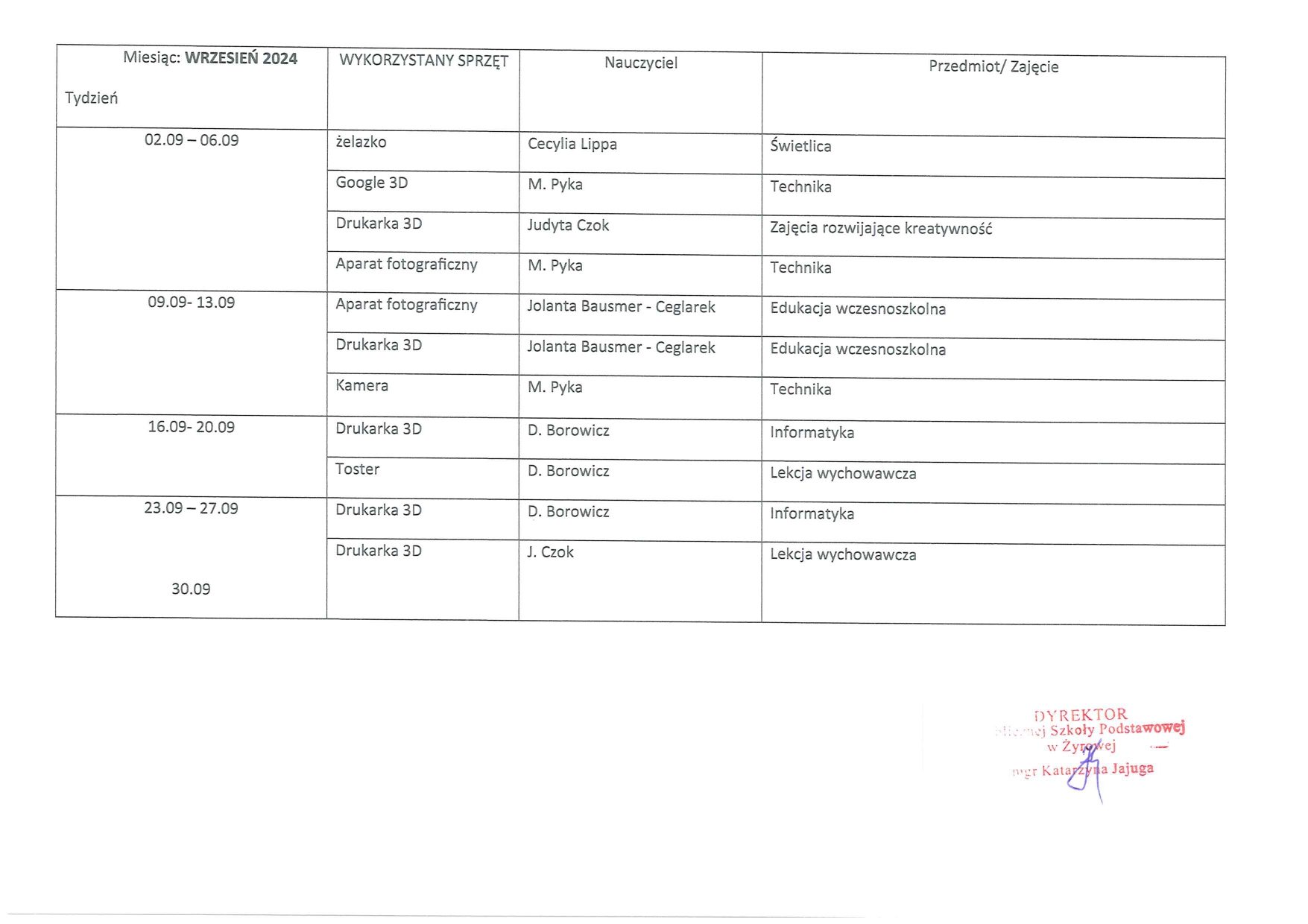 Aktualności uczniowskie WYKORZYSTANIE SPRZĘTU – wrzesień 2024 Opublikowano przez @PSP Żyrowa 2024-09-30 Data publikacji: 2024-09-30