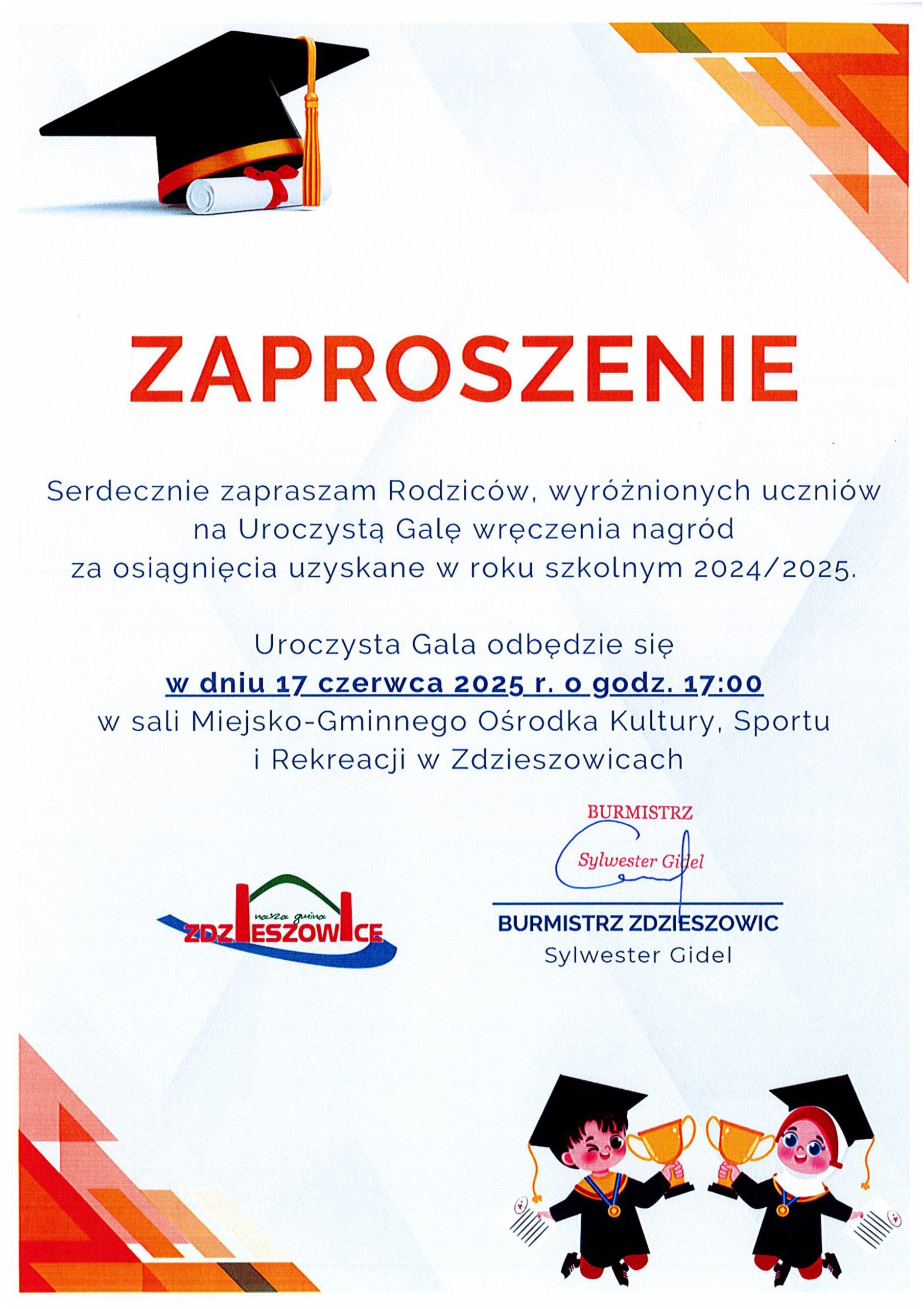 Aktualności uczniowskie ZAPROSZENIE DLA RODZICÓW WYRÓŻNIONYCH UCZNIÓW NA UROCZYSTĄ GALĘ Opublikowano przez @PSP Żyrowa 2025-06-10 Data publikacji: 2025-06-10