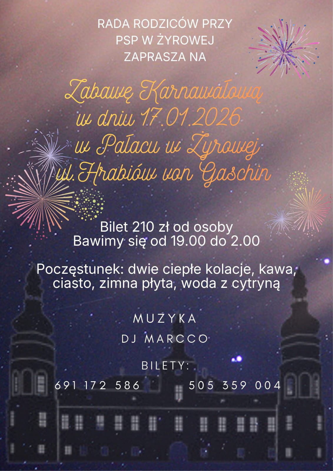 Zabawę Karnawałową, która odbędzie się 17 stycznia 2026 roku w Pałacu w